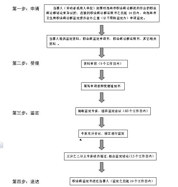 当事人如果对职业病诊断机构作出的职业病诊断结论有异议,在接到职业病诊断证明书之日起30日内,向桂林市卫计委职业病诊断鉴定委员会办公室(以下简称鉴定办)申请鉴定。