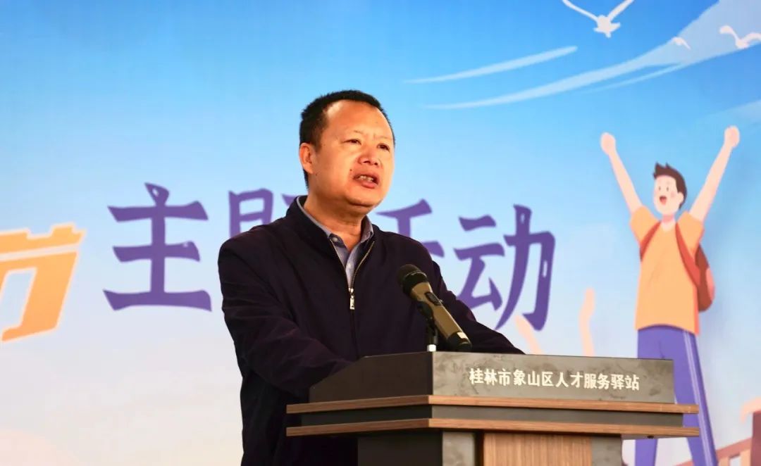 黄振宇在讲话中指出,此次活动为青年人才搭建平台、提供服务,是深化校企合作、共促大学生就业创业的实际举措,也是党建引领、群团聚力,助力桂林建设世界级旅游城市的具体行动。黄振宇强调,要坚持党建赋能,牢固树立“围绕企业发展抓党建”的理念,搭建校企融合发展平台。要始终坚持党建带群建,创新活动载体,打造校企合作名片,不断丰富“职来职往”模拟招聘活动内涵。要充分发挥人才、资源优势,大力开展“党旗领航+校企合作”活动,以优质服务促校企深度融合,凝聚起打造世界级旅游城市的强大力量。