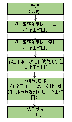 4.不足年限一次性补缴费用核定。视同缴费年限和实际缴费年限累计不满25年且其中实际缴费年限不满5年,或在职期间以住院医疗保险或单建统筹基金方式参保但选择以统账结合方式退休的,进行一次性补缴费用核定,出具《医疗保险在职转退休一次性补缴通知单》。