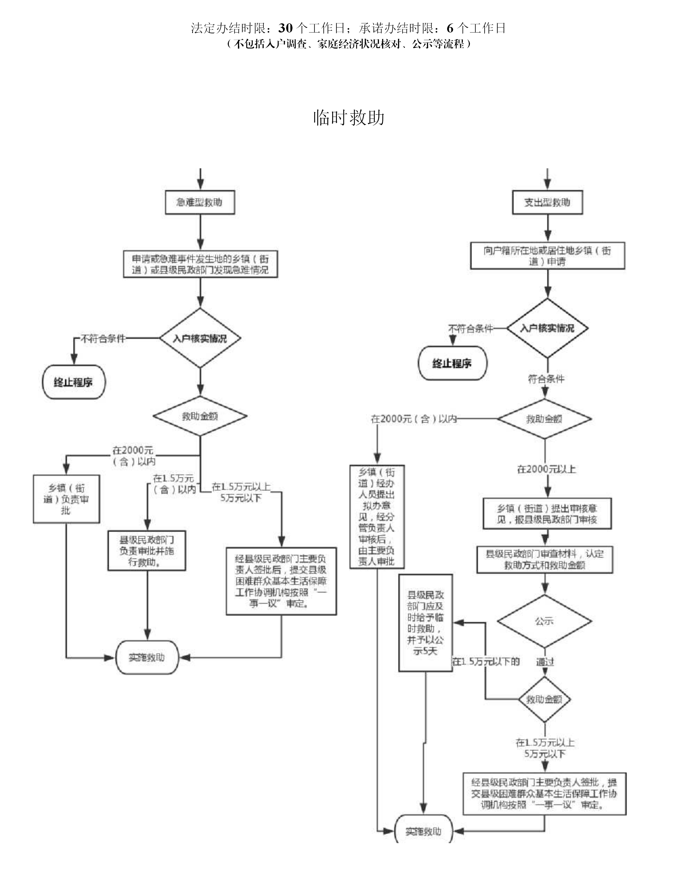 申请临时歎助金额在2000元(含)以下,乡镜(街道)经办人员提出概办意见,经分管 民政的乡镜(街道)负责人甫核后,由乡镇(街道)主要负责人审批并在3个工作日实施 教助。 申请临时救助金额在2000元以上的,县级民政部门全面审查乡镜(街道)上报的相关材 料,10个工作日内就救助方式和歎助金额作出认定。公示5天后实施救助。 教助金额在1.5万元以上的,县级民政部门全面审查乡镜(街道)上报的相关材料,10个 工作日内就救助方式和歎助金额作出认定。公示5天后实施救助。提交县级困难群众基本 生活保障工作协调机构按照“一事一议''宙定后并实施救助。 |