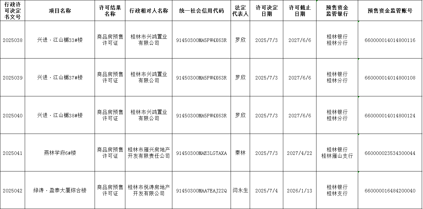 第2025038、2025039、2025040、2025041、2025042号商品房预售许可证结果公示
