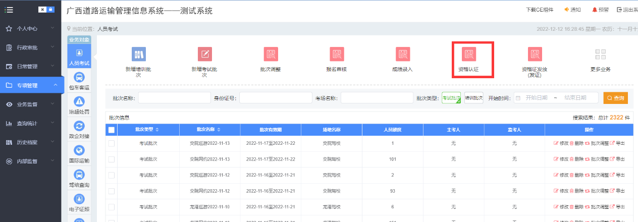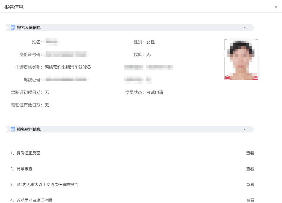点击专项管理-人员考试-查询,选择要审核的网上报名考试批次,点击报名审核,点击人员姓名,可查看报名信息。