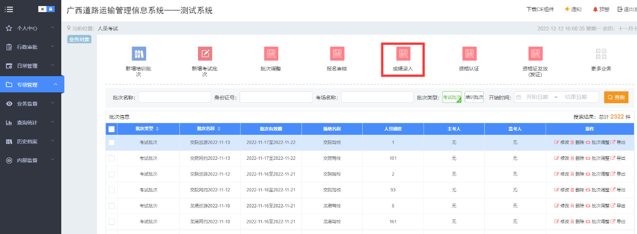 管理部门根据报名信息组织考试,考试结束后,可使用成绩录入功能,将成绩导入系统。