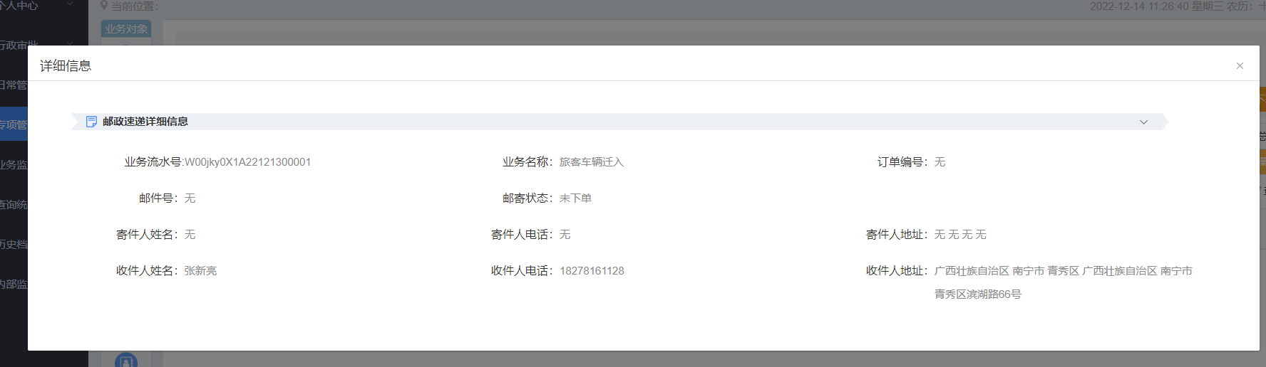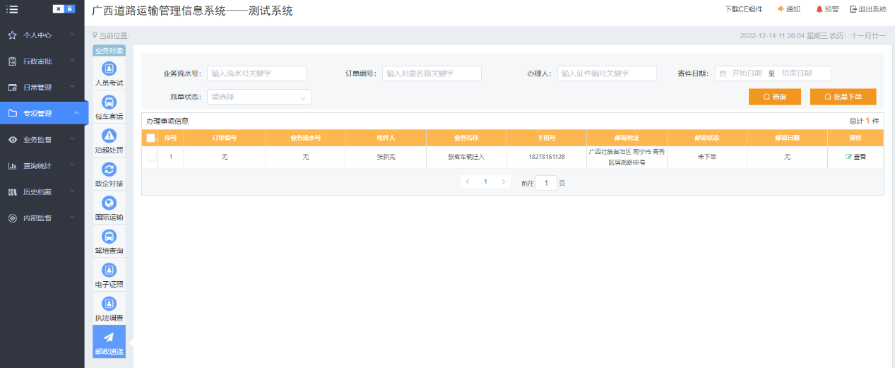 打开专项管理界面,选择“邮政速递”功能,根据派单状态办理未派单的业务。