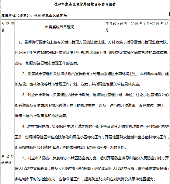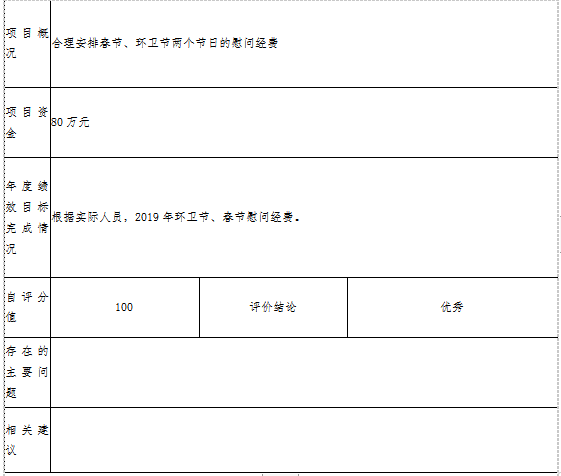 根据财政预算管理要求,2019年我部门对“市容系统节日慰问60万”项目进行了绩效评价。从评价情况来看,支出绩效情况良好,项目预算申报、组织实施、资金支付等均比较规范,项目执行的经济性、效率性、有效性也比较好,均达到了项目申请时设定的各项绩效目标。