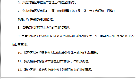 1、贯彻执行国家和上级有关城市管理方面的法律法规、方针政策,指导区城市管理监察大队、区环境卫生管理站做好辖区市容环境卫生管理和保障工作;研究制定本城区城市管理的具体措施、办法,加强对辖区城市管理工作的监察。