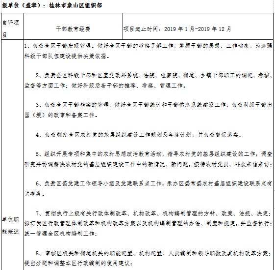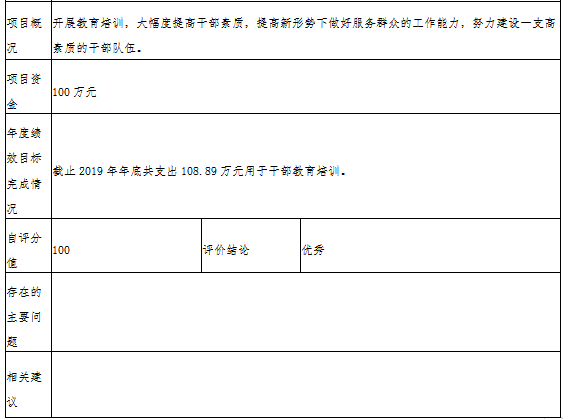 根据财政预算管理要求,2019年我部门对“干部教育经费”项目进行了绩效评价。从评价情况来看,支出绩效情况良好,项目预算申报、组织实施、资金支付等均比较规范,项目执行的经济性、效率性、有效性也比较好,均达到了项目申请时设定的各项绩效目标。