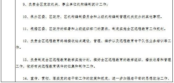 12.归口管理及审核全区党政机关和事业单位的职能配置、内设机构、人员编制和职数;审核区直有一定行政和行业管理职能的单位的机构设置、人员编制和职数。对上述机构(含内设机构)和人员编制、职数的增减与调整(含机构升格)提出审核;审核区直党政机关、事业单位、乡镇内设机构和下属事业机构。