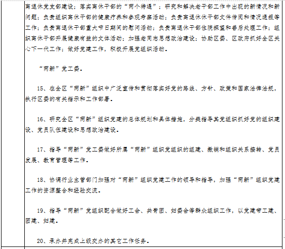 9.负责落实上级党委有关两新组织党建工作的政策要求,牵头抓好全区两新组织党建、党风廉政建设和意识形态等工作,总结、宣传两新组织先进典型经验。