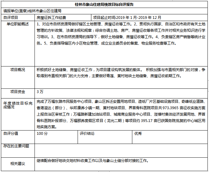 根据财政预算管理要求,2019年我部门对“房屋征拆工作经费”项目进行了绩效评价。从评价情况来看,支出绩效情况良好,项目预算申报、组织实施、资金支付等均比较规范,项目执行的经济性、效率性、有效性也比较好,均达到了项目申请时设定的各项绩效目标。