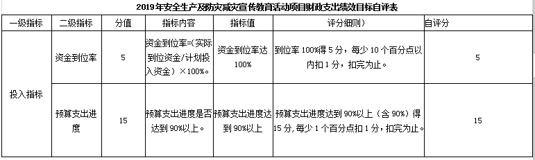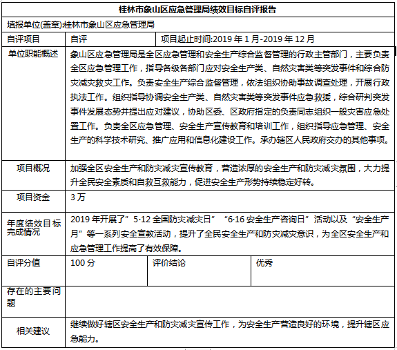根据财政预算管理要求,2019年我部门对“安全生产及防灾减灾宣传教育活动”项目进行了绩效评价。从评价情况来看,支出绩效情况良好,项目预算申报、组织实施、资金支付等均比较规范,项目执行的经济性、效率性、有效性也比较好,均达到了项目申请时设定的各项绩效目标。