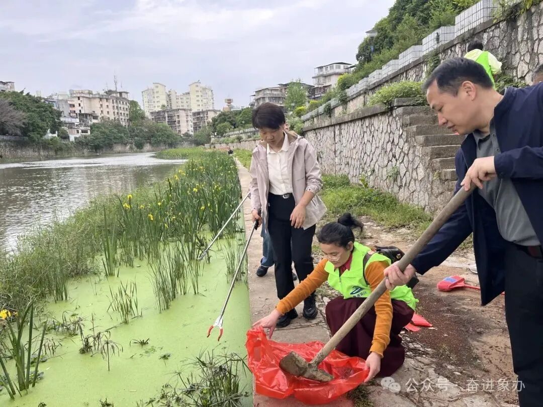 在漓江支流宁远河沿岸,区委副书记、代区长蒋玲荣,区人大常委会副主任白峰与象山街道干部职工、社区居民组成的“漓江保护志愿服务队”,手持铁铲、扫帚、铁钳、长杆等工具,对沿岸杂草、白色垃圾及漂浮物进行全面清理。“保护漓江要从每一寸河岸、每一米河道抓起。” 蒋玲荣同志在劳动间隙强调,要将志愿服务与日常巡河相结合,建立 “发现问题 - 整改落实 - 长效管护” 闭环机制,确保 “水清、岸绿、景美”。