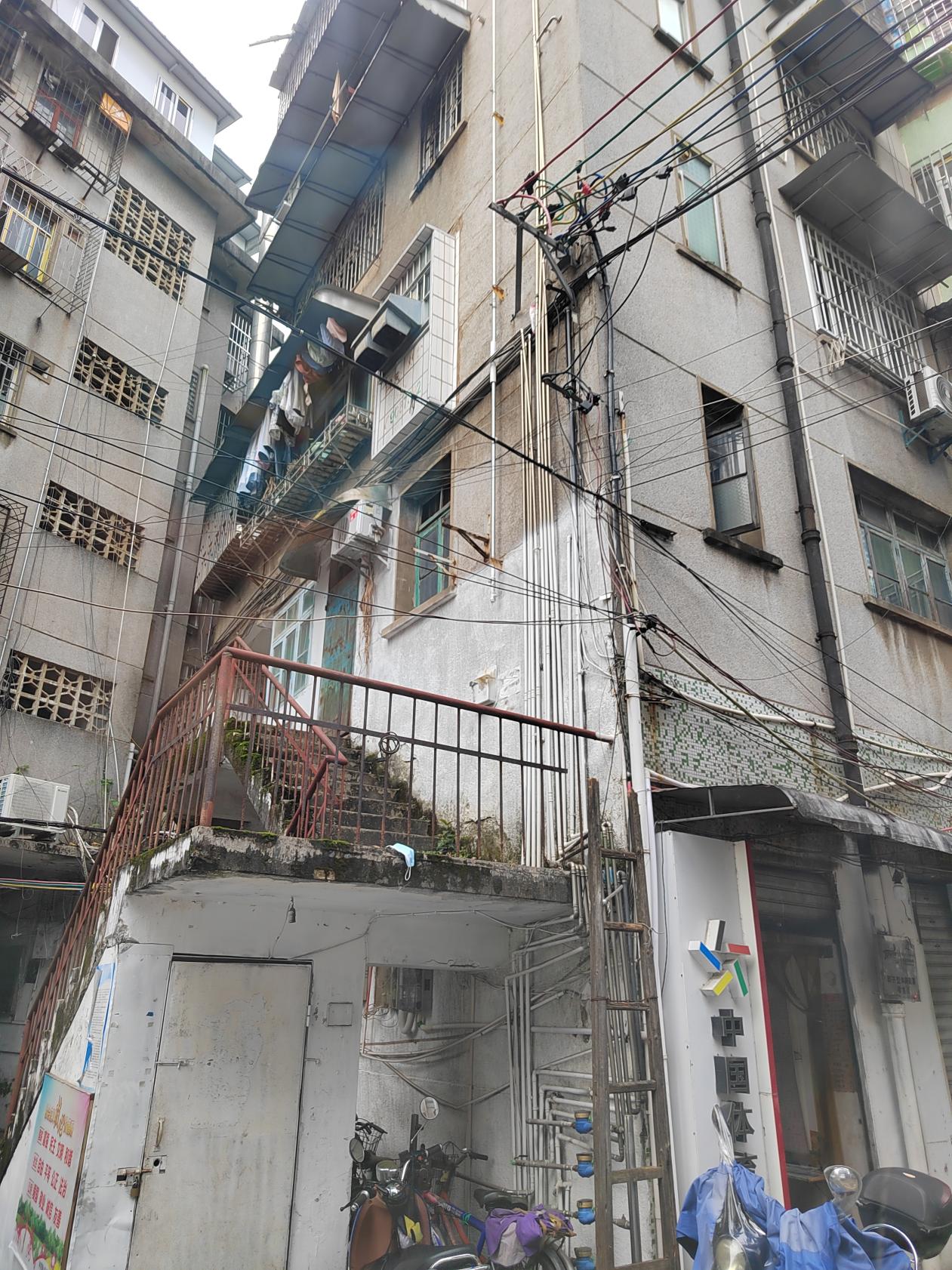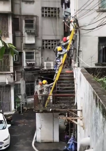 工作过程中使用了绝缘梯,上梯作业人员郑某某穿全棉长袖工作服,戴安全帽、戴胶质绝缘手套(绝缘手套只能覆盖腕关节后10厘米左右),郑某某登梯爬上位于民主路26号居民楼外侧转角处的低压线路墙担处,右脚站在绝缘梯上,左腿跨坐在水平安装的金属三角框墙担处进行作业(如图),安全带固定在墙担处。
