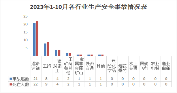 据统计,1-0月,全市通过生产安全事故统计信息直报系统(以下简称直报系统)报送各类生产安全事故38起、死亡40人、受伤12人,事故起数、受伤人数同比分别减少1起、15人,下降2.56%、55.56%,死亡人数同比增加3人、上升8.11%。其中较大事故1起、死亡3人、受伤2人,事故起数、死亡人数同比分别持平,受伤人数同比上升100%。无重大和特别重大事故发生。