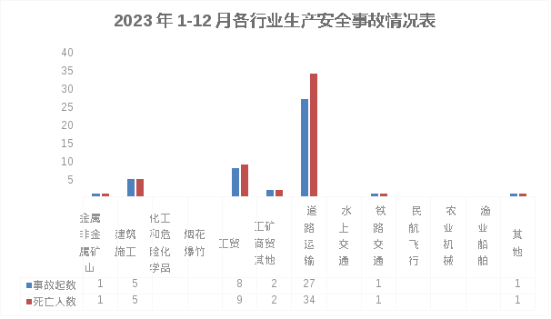 据统计,1-12月,全市通过生产安全事故统计信息直报系统(以下简称直报系统)报送各类生产安全事故45起、死亡53人、受伤19人,事故起数、受伤人数同比分别减少6起、14人,下降11.76%、42.42%,死亡人数同比增加6人、上升12.77%。其中较大事故2起、死亡9人、受伤3人,事故起数、死亡人数、受伤人数同比分别上升100%、200%、200%。无重大和特别重大事故发生。