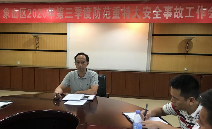 7月28日上午,象山区2020年第三季度防范重特大安全事故暨防汛抗旱、森林防灭火工作部署会在区政府五楼3号会议室召开。会议通报分析了我区2020年上半年生产安全事故情况,分析研判当前形势,部署三季度安全生产、防汛抗旱、森林防灭火工作。副区长崔海健出席会议并讲话,区安委会各成员单位领导参加会议。
