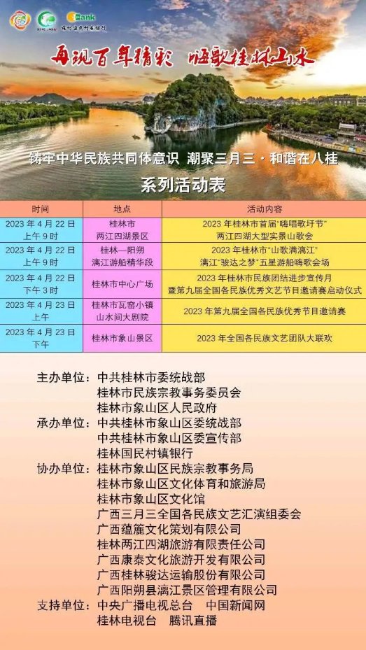 为充分利用好“三月三歌圩节”这一传统节日,弘扬优秀民族文化、社会主义核心价值观,宣传桂林世界级旅游城市建设,宣传桂林市全国民族团结进步示范市经验成果,进一步巩固和发展平等、团结、互助、和谐的社会主义民族关系,铸牢中华民族共同体意识。中共桂林市委统战部、桂林市民族宗教事务委员会、桂林市象山区人民政府将于2023年4月21日—4月26日在桂林市象山景区、桂林市中心广场、桂林市山水间大剧院和桂林两江四湖景区联合举办“铸牢中华民族共同体意识——潮聚三月三·和谐在八桂”系列活动。