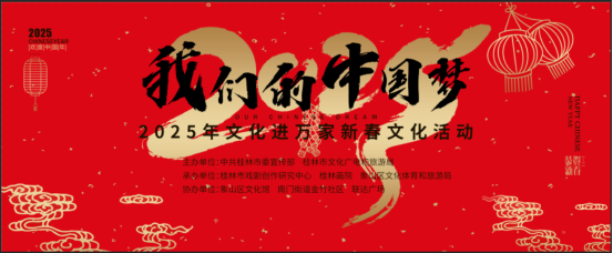 祥龙辞旧岁,灵蛇踏歌来。在这岁序更替、辞旧迎新之际,为进一步丰富群众的精神文化生活,营造欢乐的节日氛围,1月18日下午,“我们的中国梦”2025年文化进万家春文化活动在桂林市象山区联达广场举行。此次活动由中共桂林市委宣传部 、桂林市文化广电和旅游局主办;桂林市戏剧创作研究中心 、桂林画院 、象山区文化体育和旅游局承办;象山区文化馆 、南门街道金竹社区、 联达广场协办。