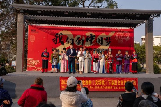 活动现场热闹非凡、形式丰富多样。不仅有桂剧、彩调、广西文场等文艺演出,现场还有免费写春联、非遗展示、旅游宣传、防艾宣传等互动。