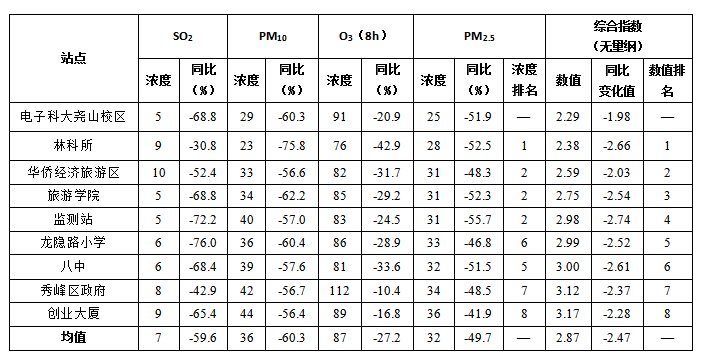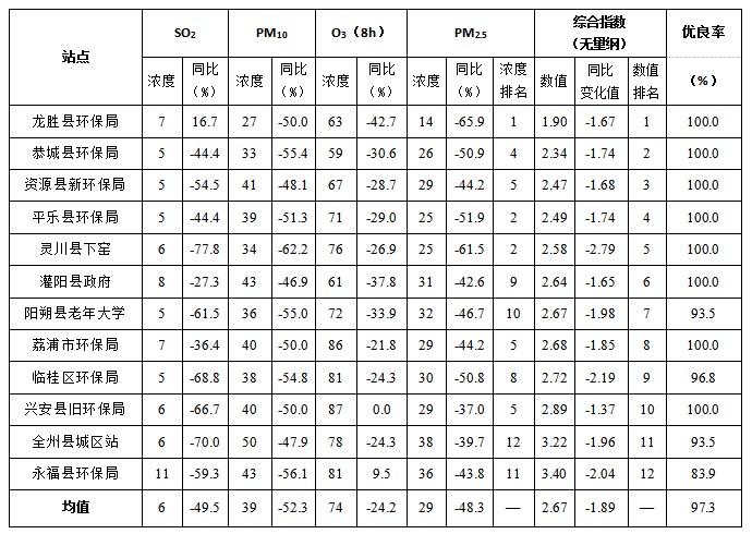 表1 1月市区站点(不含临桂区环保局)监测指标浓度值及综合指数表(实况) 单位:μg/m3