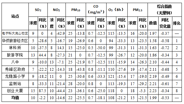 站点监测指标浓度值及综合指数表
