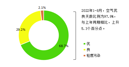 2022年8月桂林市城市环境空气质量指数(AQI指数)范围29~72,优良天数31天,其中优22天,良9天,空气质量优良天数比例为100%。2022年1-8月,桂林市空气质量优良天数比例为97.9%,与上年同期相比,上升5.3个百分点。