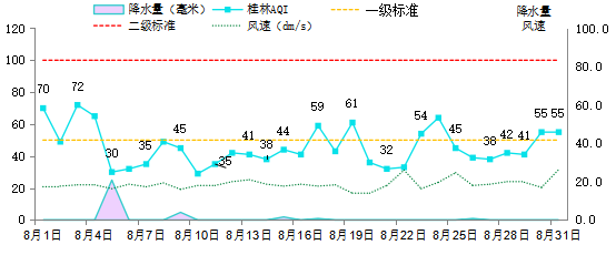 2022年8月各空气站点平均风速为1.9m/s(上月2.0m/s),平均降水量为0.9mm(上月3.5mm),平均湿度为68.9%(上月73.0%),平均温度30.8℃(上月30.2℃)。8月桂林市气温较高,以晴为主,降雨量少,空气质量以优为主,其中良天数中,首要污染物均为O3,图2为AQI与气象参数变化趋势图。