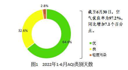 截至6月30日,2022年空气污染物浓度均值同比情况见表2,与去年同期相比,O3浓度上升,其它污染物浓度均下降。