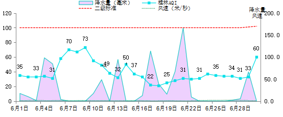 6月平均风速为1.6m/s(上月1.6m/s),平均降水量为29.2mm(上月8.1mm),平均湿度为84.5%(上月77.0%),平均温度26.6℃(上月21.9℃)。6月份桂林市气温明显升高,以连续降雨天气为主,降雨量大,扩散和清除条件较好,空气质量以优为主,由于温度上升及太阳辐射增强,以臭氧为首要污染物的天数增多,图2为AQI与气象参数变化曲线图。