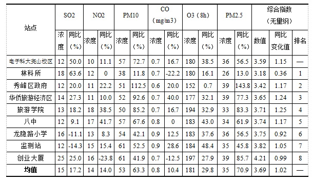 表1 9月桂林市城区站点监测指标浓度值及综合指数表 单位:μg/m3