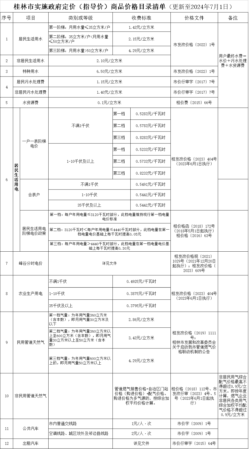桂林市实施政府定价(指导价)商品价格目录清单(更新至2024年7月1日)