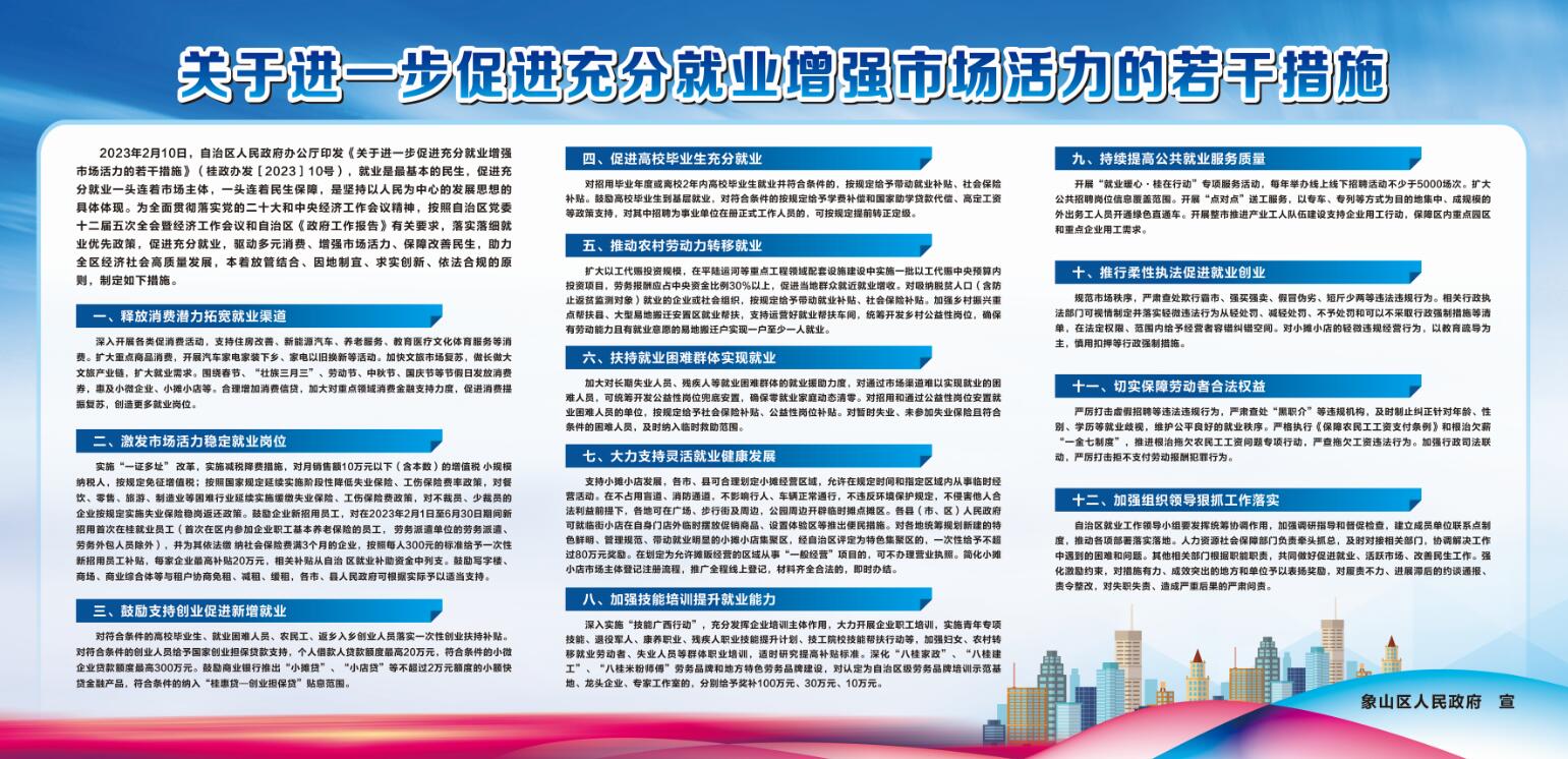 根据《广西壮族自治区人民政府办公厅印发关于进一步促进充分就业增强市场活力若干措施的通知》(桂政办发〔2023〕10号)精神,和自治区人社厅的要求,区厅制作了促进就业12条措施宣传板报,现将宣传板报样式发送给你们,请以政府名义印制并在各个乡镇街道张贴宣传。此项政策的相关工作作为今年就业方面的重要工作,请各单位抓好落实。
