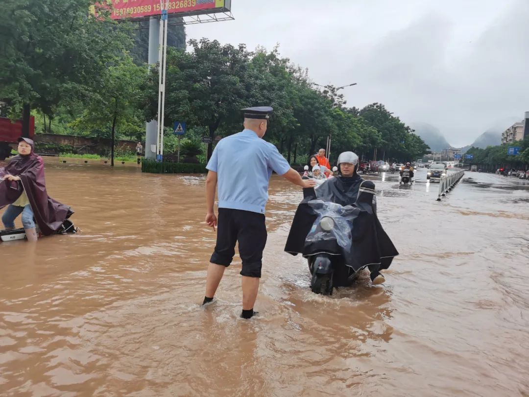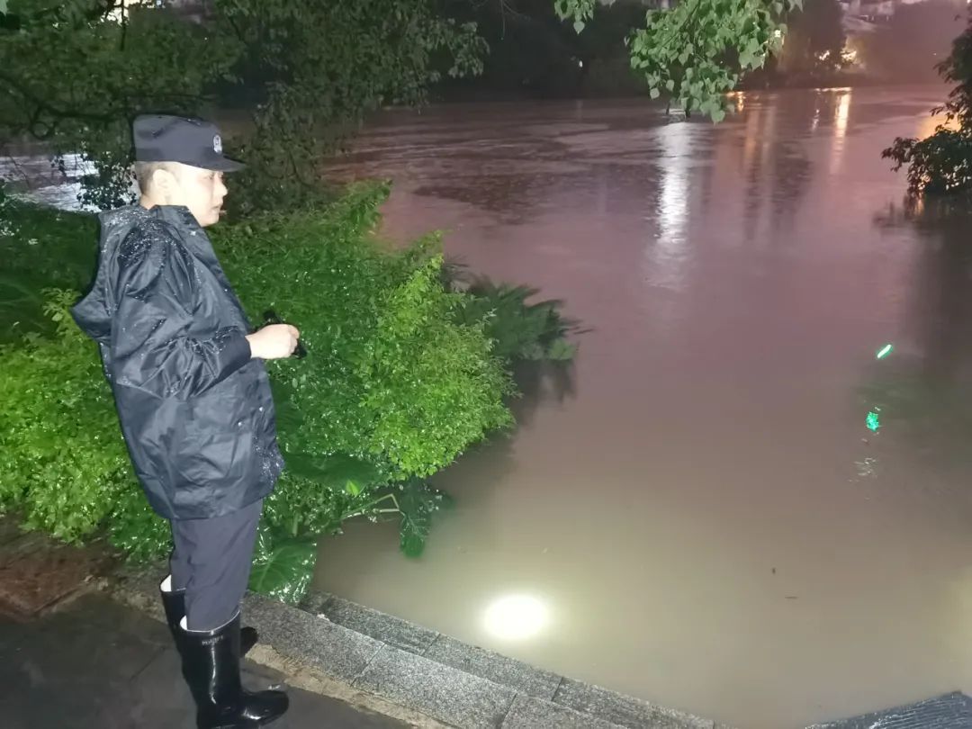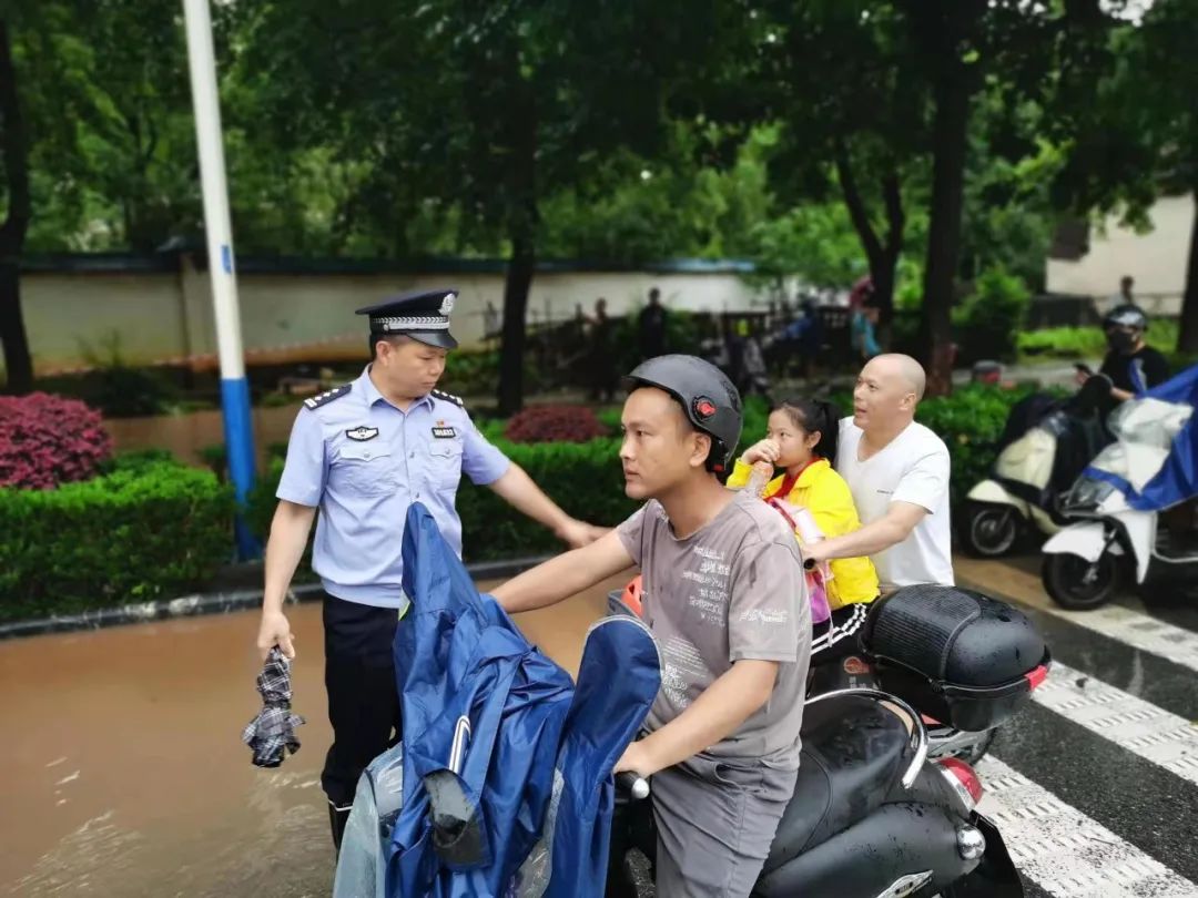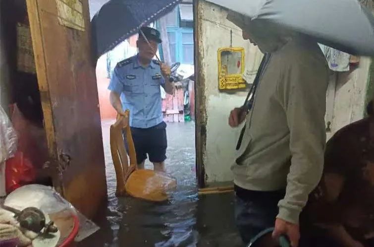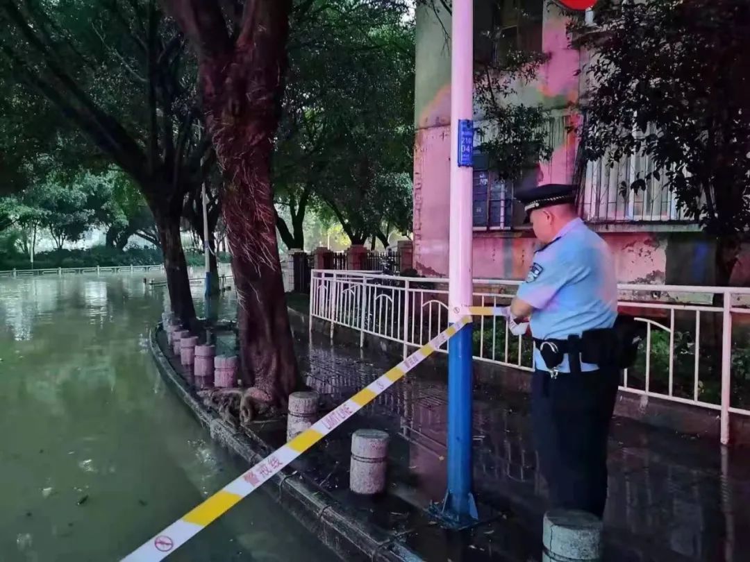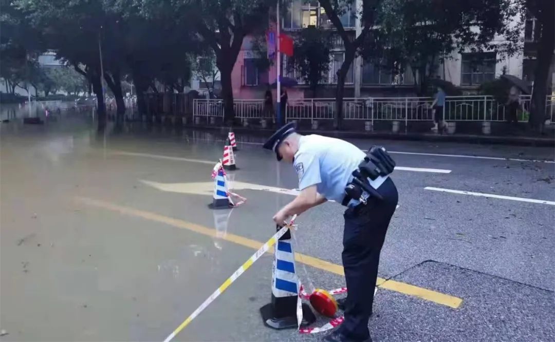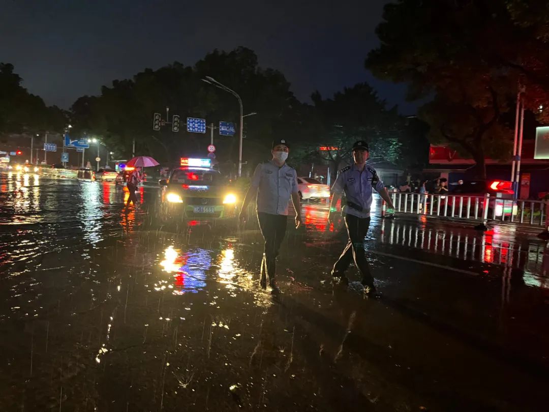风雨里,分局警力在内涝、积水严重地段开展执勤,对积水较为严重的路段、路口进行安全警示,对过往车辆、行人加强预警提示、疏导分流,劝离围观群众,清理水中障碍、排污口垃圾、搀扶过往行人,确保辖区过往群众、车辆的安全通行。