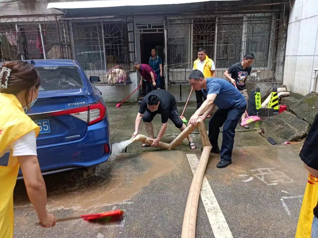 6月21日上午,天鹅社区联合挂点单位象山区区委办、象山区司法局帮助中山南路29号受灾小区居民进行车辆清淤