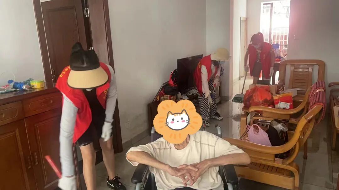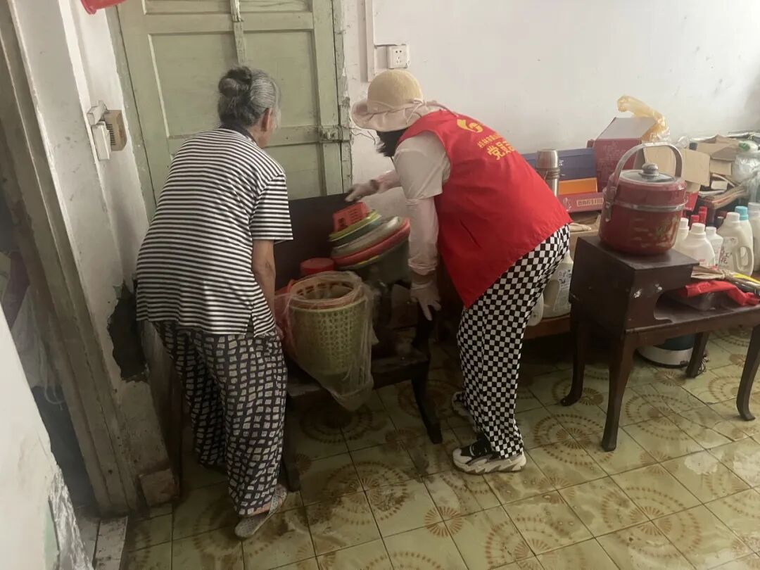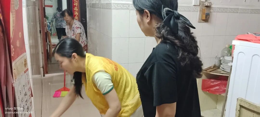 6月21日,甘棠社区“两委”干部到民族里119号受灾老人家中帮助打扫卫生