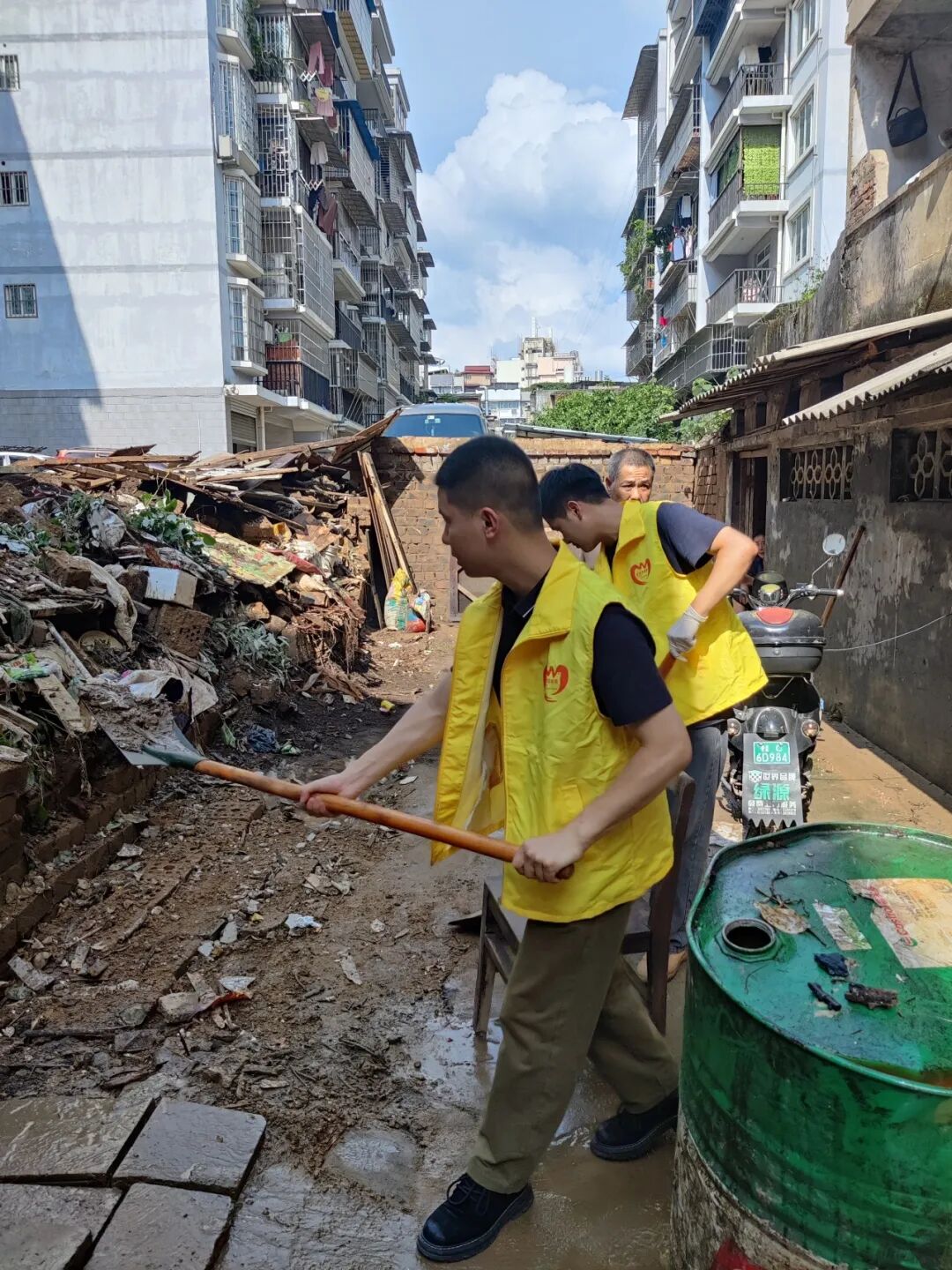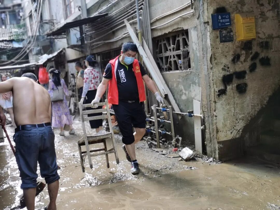 6月21日,雉山社区党员志愿者到雉山路40号受灾残疾人员家中帮助打扫卫生