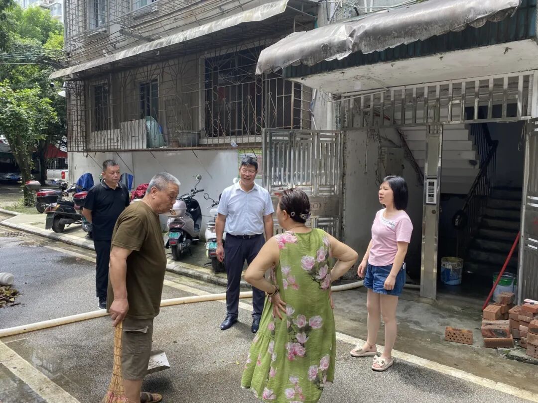 6月21日上午,区政府二级调研员周灿、区城管局局长陈从军到新竹社区调研指导灾后恢复相关工作