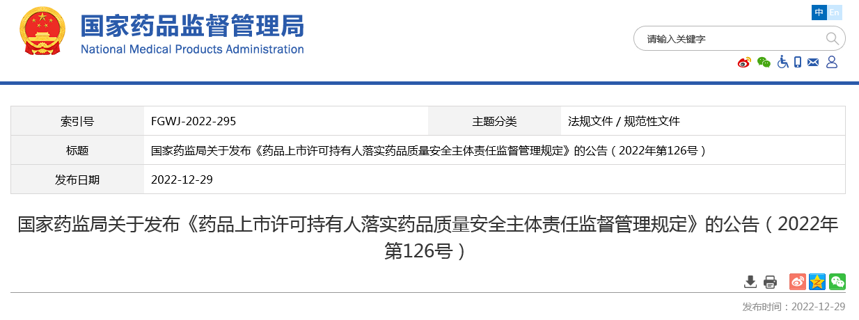 为落实药品上市许可持有人的质量主体责任,根据《中华人民共和国药品管理法》等法律法规,国家药监局制定了《药品上市许可持有人落实药品质量安全主体责任监督管理规定》,现予发布,自2023年3月1日起实施。