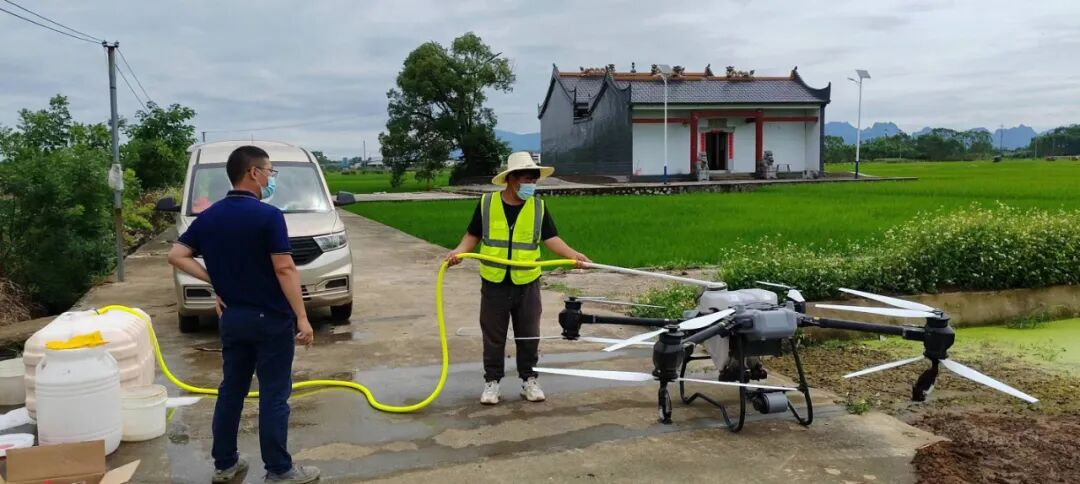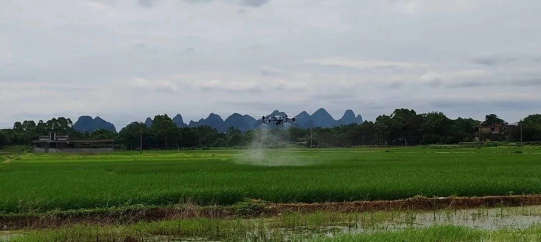 在二塘乡阳家村委潭南村、茶店村,技术人员通过遥控操作无人机,将农药均匀喷洒在早稻叶面上,实现短时间内完成0.1万亩的防治喷洒作业,有效地防治稻飞虱、稻纵卷叶螟、二化螟、水稻纹枯病及稻瘟病、玉米螟、草地贪夜蛾、其他病虫害,确保今年早稻丰产丰收。