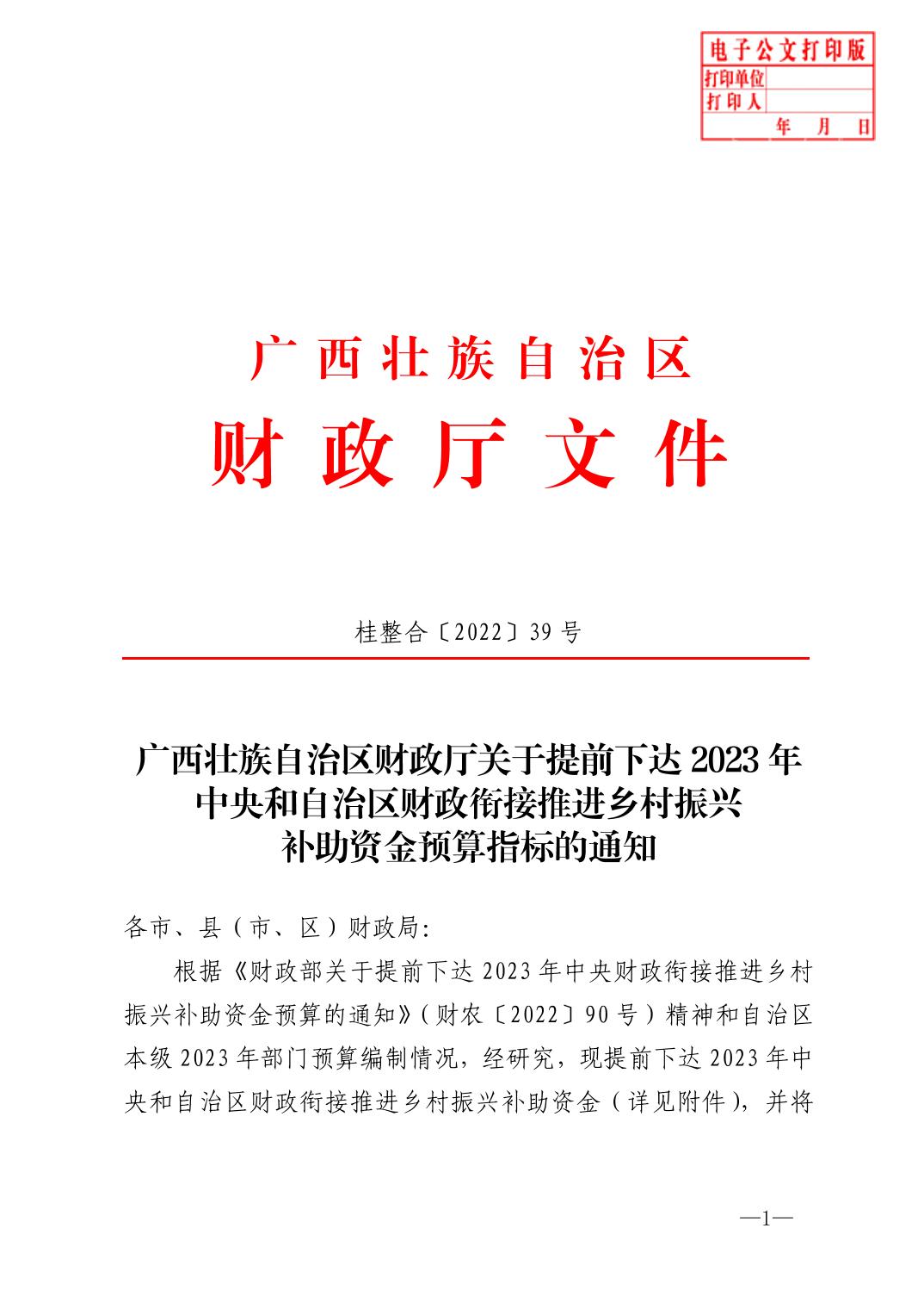 广西壮族自治区财政厅关于提前下达2023年中央和自治区财政衔接推进乡村振兴补助资金预算指标的通知