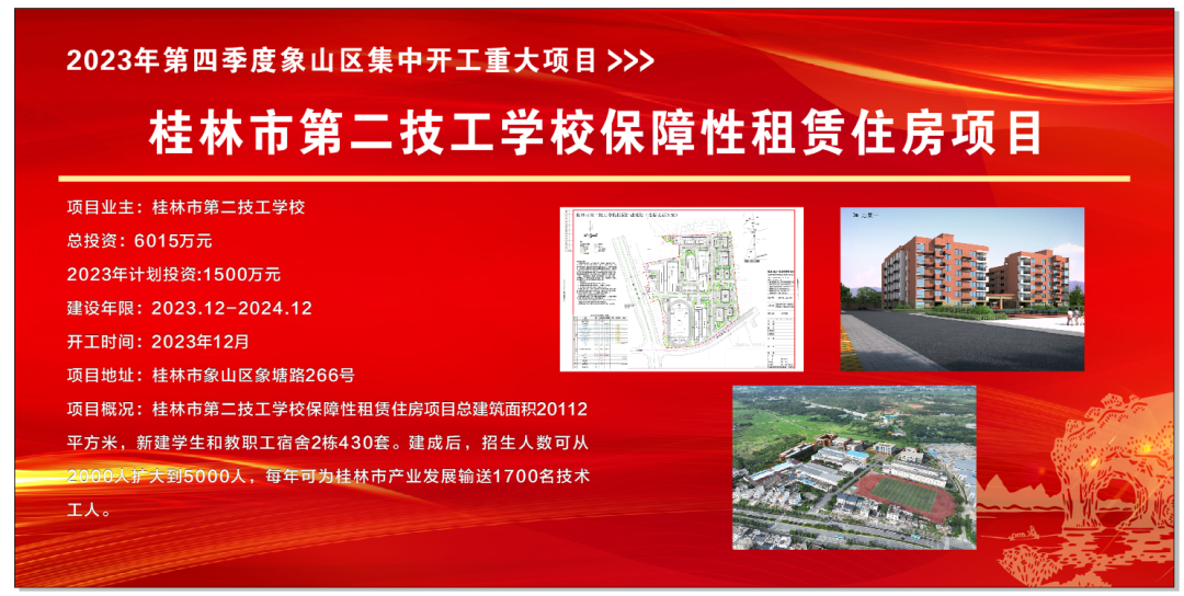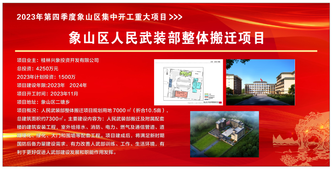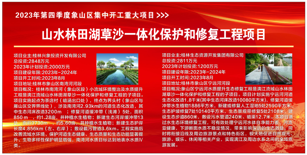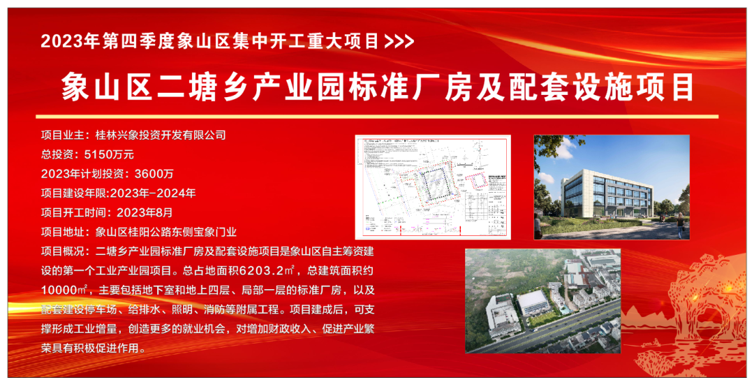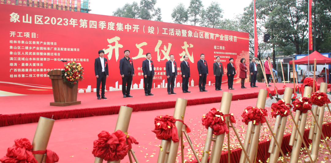 此次集中开工的有桂林市象山区教育产业园、象山区二塘乡产业园标准厂房及配套设施、象山区人民武装部整体搬迁、漓江流域山水林田湖草沙一体化保护和修复工程、绿涛·盈泰大厦、广西铁路康养桂林康养中心新建康养楼、桂林市第二技工学校保障性租赁住房7个项目,涵盖工业产业、文化旅游、教育事业、生态环保等多个领域,计划总投资25.1亿元。竣工的有枫丹丽苑商务办公配套附楼改建、桂林香江饭店扩建、桂林壹米厨房3个项目。这一批项目的实施,将为实现年度经济社会发展目标、积蓄象山长远发展后劲提供有力支撑。