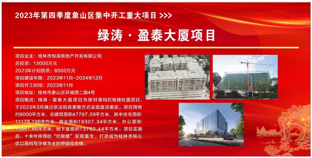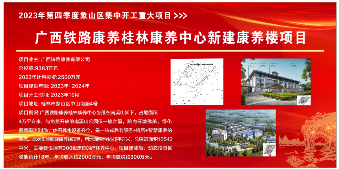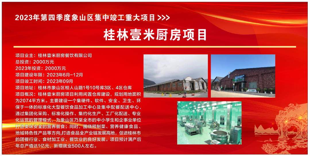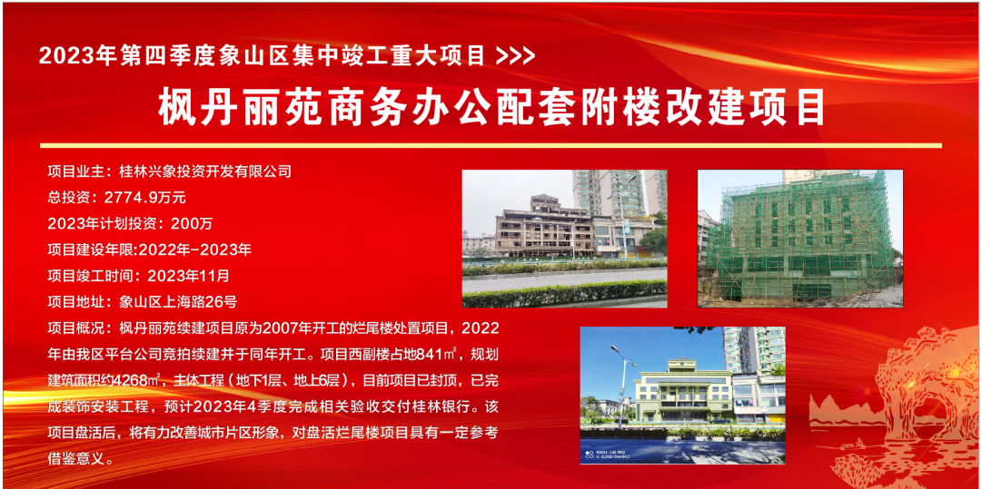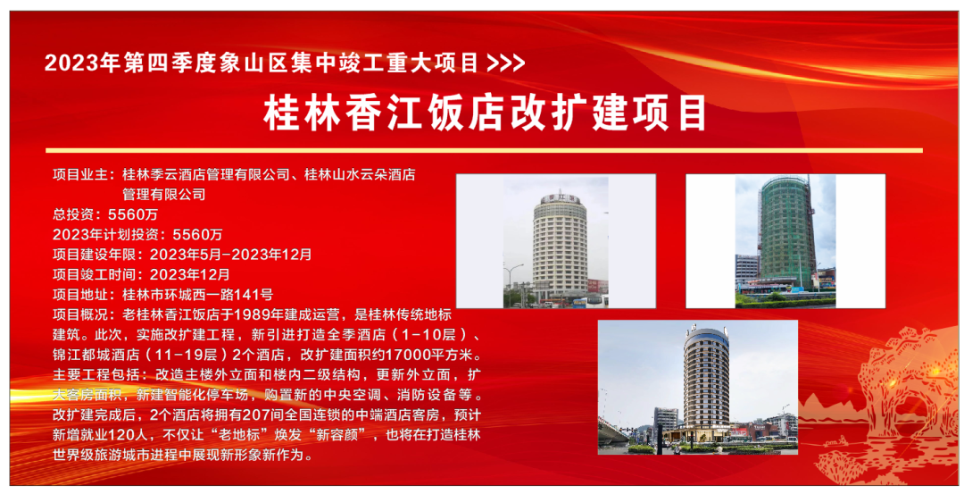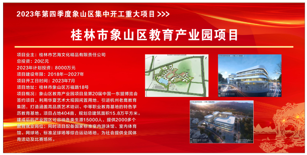 此次集中开工的有桂林市象山区教育产业园、象山区二塘乡产业园标准厂房及配套设施、象山区人民武装部整体搬迁、漓江流域山水林田湖草沙一体化保护和修复工程、绿涛·盈泰大厦、广西铁路康养桂林康养中心新建康养楼、桂林市第二技工学校保障性租赁住房7个项目,涵盖工业产业、文化旅游、教育事业、生态环保等多个领域,计划总投资25.1亿元。竣工的有枫丹丽苑商务办公配套附楼改建、桂林香江饭店扩建、桂林壹米厨房3个项目。这一批项目的实施,将为实现年度经济社会发展目标、积蓄象山长远发展后劲提供有力支撑。
