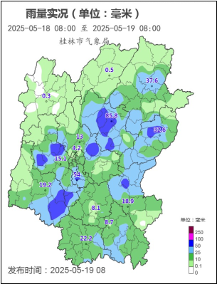 根据桂林市地面气象自动站网监测:5月18日8时至19日8时,7个县(市、区)的12个乡镇有暴雨,12个县(市、区)的47个乡镇有大雨,14个县(市、区)的75个乡镇有中雨,最大为兴安严关镇87.4毫米(附图)。最大小时雨强为64.7毫米,出现在兴安国家气象观测站。