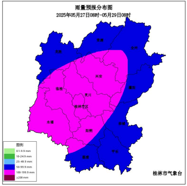 27-28日,全市阴天有暴雨、局部大暴雨到特大暴雨,并可能伴有短时雷暴大风、冰雹等强对流天气。最有可能出现大暴雨以上降雨的县(市、区)有:全州(安和、才湾、凤凰、蕉江、绍水、石塘、咸水),资源(两水、中峰),龙胜(江底、龙脊、三门),灌阳(洞井、观音阁、灌阳、西山、新圩),恭城(嘉会、栗木、西岭),阳朔(白沙、福利、高田、金宝、葡萄、兴坪、阳朔镇、杨堤),荔浦(大塘、花篢、马岭、蒲芦、双江)、兴安、灵川、临桂、永福各乡镇及桂林市区。