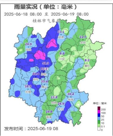 根据桂林市地面气象自动站网监测:6月18 日08时至6月19 日 08 时,4个县(市、区)的5个乡镇有大暴雨,13个县(市、区)的41个乡镇有暴雨,13个县(市、区)的68个乡镇有大雨,最大为兴安华江瑶族乡猫儿山212.4毫米,其次为灵川兰田142.6毫米(附图)。