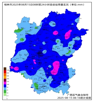 根据桂林市地面气象自动站网监测:2025年8月14日8时至15日8时,100毫米以上有9个县(区)的24个站点,50-100毫米有17个县(区)的152个站点,25-50毫米有15个县(区)的79个站点,10-25毫米有11个县(区)的19个站点,最大为全州咸水167.3毫米(附图)。
