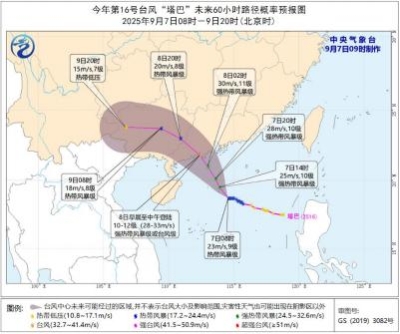 南海热带低压于昨天(6日)晚上8点钟加强为今年第16号台风“塔巴”(热带风暴级),今天(7日)早晨8点钟其中心位于距离广东省阳江市东南方向约 445公里的南海北部海面上,就是北纬18.7度、东经114.6度,中心附近最大风力有9级(23米/秒),中心最低气压为990百帕,七级风圈半径180-260公里。预计,“塔巴”将以每小时15-20公里的速度向北偏西方向移动,强度逐渐增强,并将于8日中午在广东珠海至湛江一带沿海登陆(强热带风暴级或台风级,28-33米/秒,10-12级),登陆后强度逐渐减弱(附图1) 。