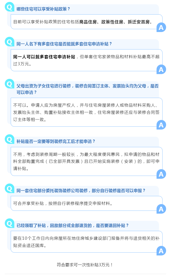 对个人消费者自行装修的,按照消费者所购买的单套住宅家装物品和材料总价款的20%给予一次性补贴,累计补贴最高不超过3万元。