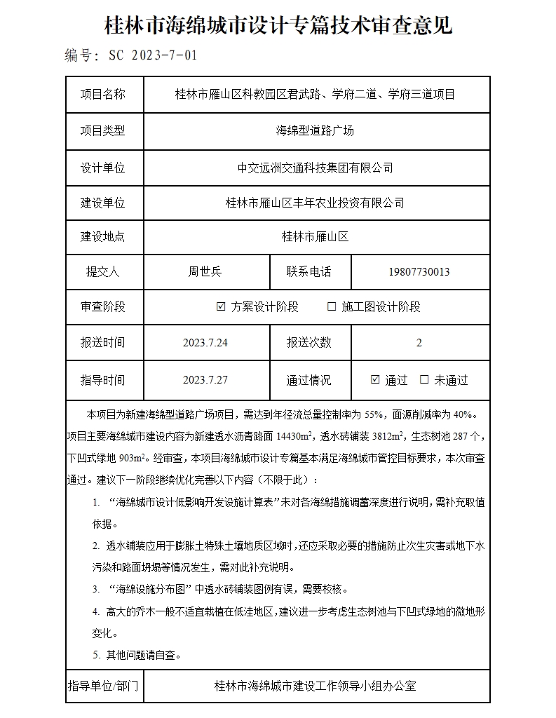桂林市雁山区科教园区君武路、学府二道、学府三道项目海绵城市设计专篇技术审查意见