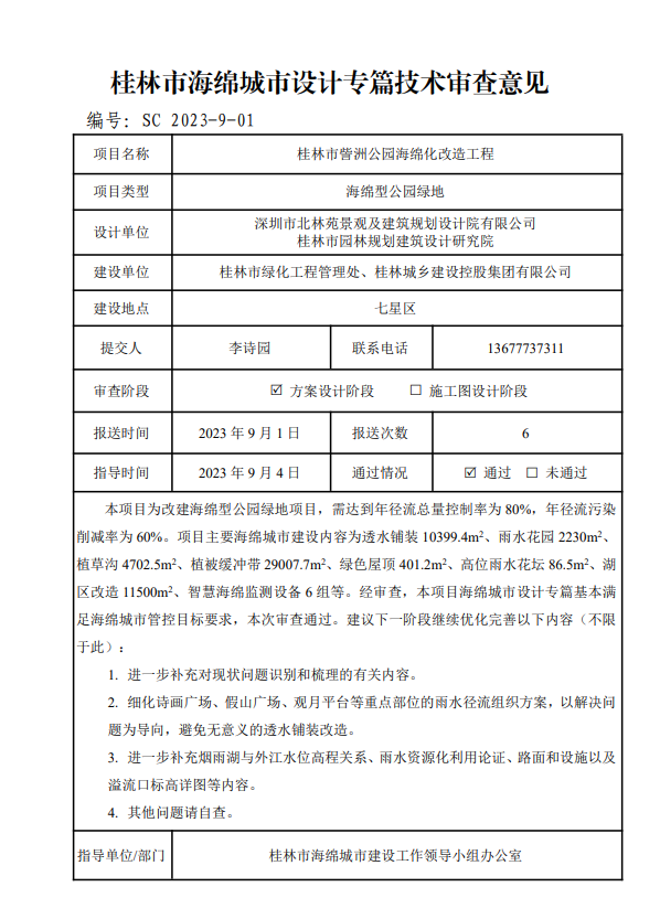 桂林市訾洲公园海绵化改造工程海绵城市设计专篇技术审查意见